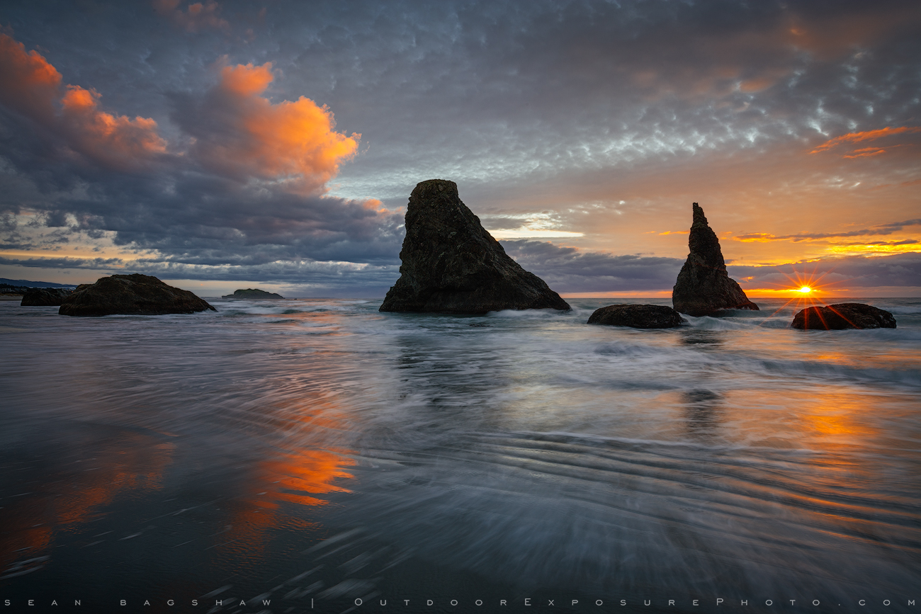 Canon 5DSR, 25mm, polarizer, 1 second, f/22 (for sun star), ISO 100. Two exposures blended for foreground wave motion and reflection color.