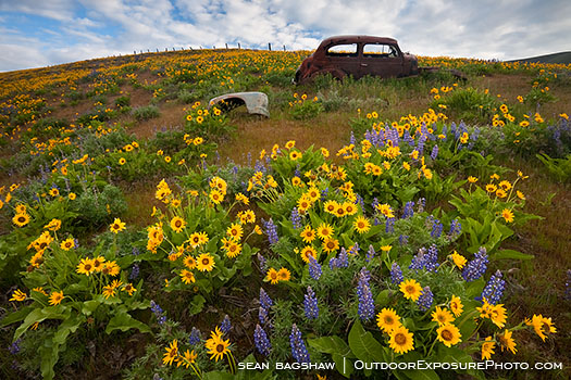 balsam root, Columbia, Columbia River, dalles mountain ranch, Gorge, lupin, river, spring, wildflowers, vibrant, blooming, flowers, yellow, purple, lupine, abandoned, car, automobile, rust, broken, scattered, horizontal, color image