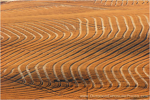 During a fall photo trip in 2005 I traveled through the amazing Palouse area of Washington. It is a major wheat-producing agricultural area about 160 miles north of the Oregon Trail. Harvesting equipment creates repeating patterns across the landscape as they cut the wheat during the harvest season. It is best to photograph the patterns in early morning or late afternoon when the sun is low in the sky and the shadows accentuate the lines.