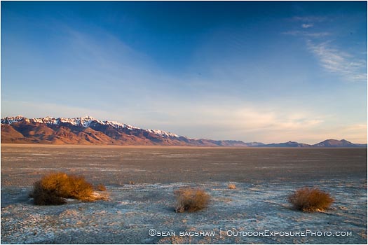 Snow tipped peaks lie beyond the dry and cracked floor of the Alvord Desert in Harney County, Oregon. The desert is a 12-mile by 7-mile playa, a dry lake bed, and averages 7 inches of rain a year. Two mountain ranges separate it from the Pacific Ocean?the Coast Range, and the Cascade Mountains. Along with Steens Mountain, these topographical features create a rain shadow. The Alvord lies at an elevation of approximately 4000 feet. During the dry season, the surface is flat enough to drive across, or land small aircraft on.