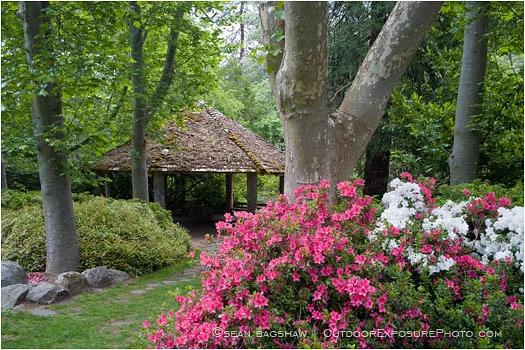 Pink and White Azaleas grow by a picinic hut in Lithia Park in Ashland, Oregon.