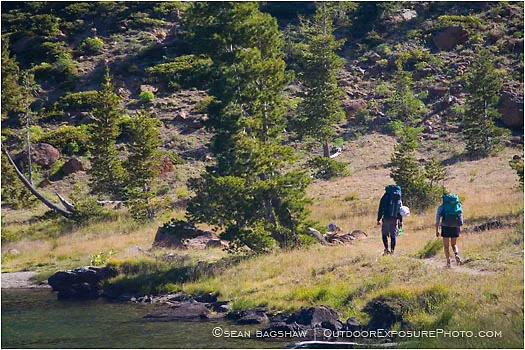 Lake, Camping, Deadfall Lakes, Mountain lake, Mount Eddy, California, Backpacking, Hiking, People, Freedom, Journey, Vacations, Horizontal, Outdoors, Trail, Rear View, Hiking, Walking, Day, Lake, Backpack, Color Image, Grass, Two People, Leisure Activity, Rocks, Backpacker