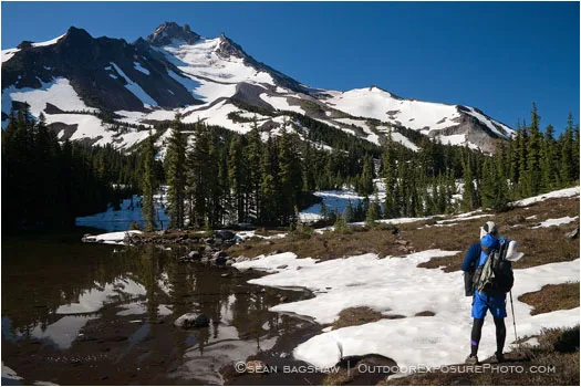 2009, backpacking, ice, Jefferson Park, lake, melt, mountain, Mt. Jefferson, Oregon, snow, volcano, volcano* cascade range, wilderness, tarn, reflection, mirrored, rocks, stones, horizontal, color image, snow capped, trees, pond, backpacker, hiker, camper, camp, tent, overlooking, under, shoreline, beside, standing, one, 1, individual, lonely, awe