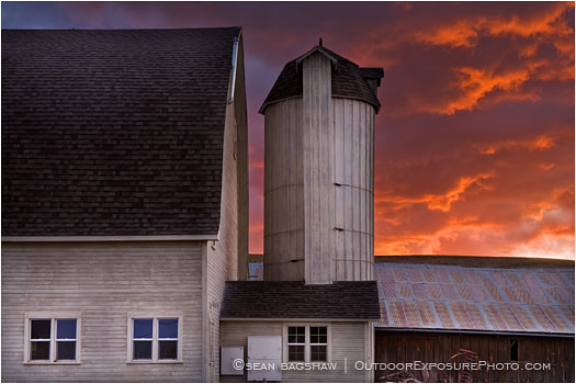 The Palouse region of Washington State offers rolling farm land, wide-open skies and interesting agriculture structures and equipment – all delights for the photographer’s eye. I took advantage of an oncoming storm of thunder and lightening to catch a brilliant backdrop for this typical barn and silo.