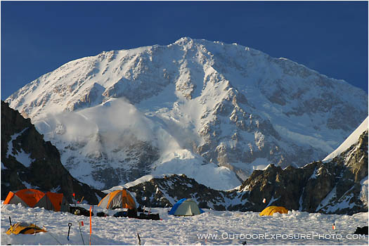 These neon colored tents blanketing the Kahiltna Glacier base camp belong to climbers waiting to summit Denali (Mt. McKinley) in Alaska. This view is of the south face of Denali which is 12 miles from the camp. Climbers fly to this base camp by glacier plane to begin expeditions on the south and west routes on the highest peak in North America.