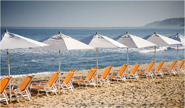 Bright orange chairs and white umbrellas await guests at the beach in Sayulita, Mexico. It’s a great spot to watch the waves, play in the sand and soak up the sun. Sayulita is a wonderful little village near Puerto Vallarta; popular with tourists from all over the world who come to enjoy surfing, quaint shops, great food, beautiful beaches and warm hospitality.