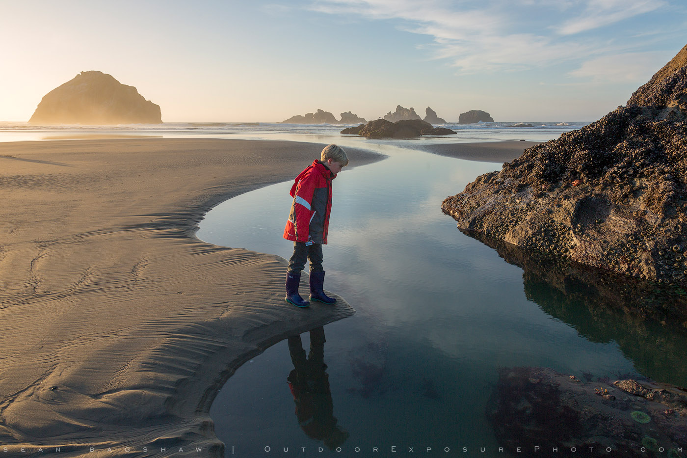 A young beach goer (my son) checks out the critters in the pools in front of Face Rock, Bandon.