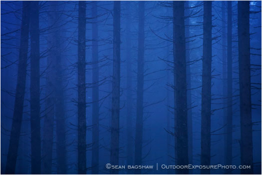 I am constantly on the lookout for Nature’s gifts – this was one of them. Low light and fog create a mysterious blue atmosphere in this dense forest near Mt. St. Helens in Washington. The branch and trunk patterns are at once bold and ethereal and create an irresistible lure to go deeper into the woods.