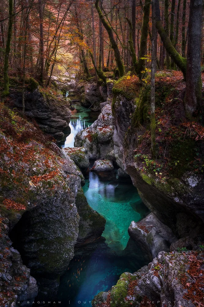 Water slicing through rock in a Slovenian forest. The signature turquoise colored water of Slovenia provides a lovely contrast of colors.