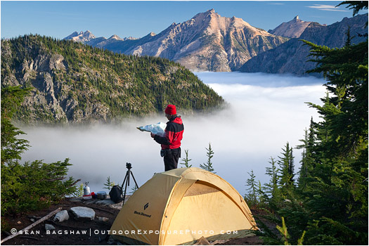 Heather Pass; North Cascades; Washington; backpacking; camp; mountains; person; tent; valley fog; wilderness