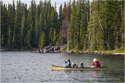 Canoers pass by the shoreline of Waldo Lake in the Cascade Mountains of Oregon.