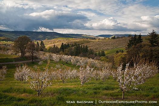 cherry orchard, cherry trees, Columbia, Columbia River, Gorge, mosier, river, spring, clouds, fields, orchards, cherry, horizontal, color image, blooming, lush, quiet, Oregon