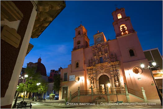 The Iglesia San Francisco in Guanajuato, Mexico was constructed by Franciscans and completed in 1792. The building material of pink stone makes a striking contrast against the evening sky. The church’s illumination and ornate entry and bell towers bring many tourists to its site.