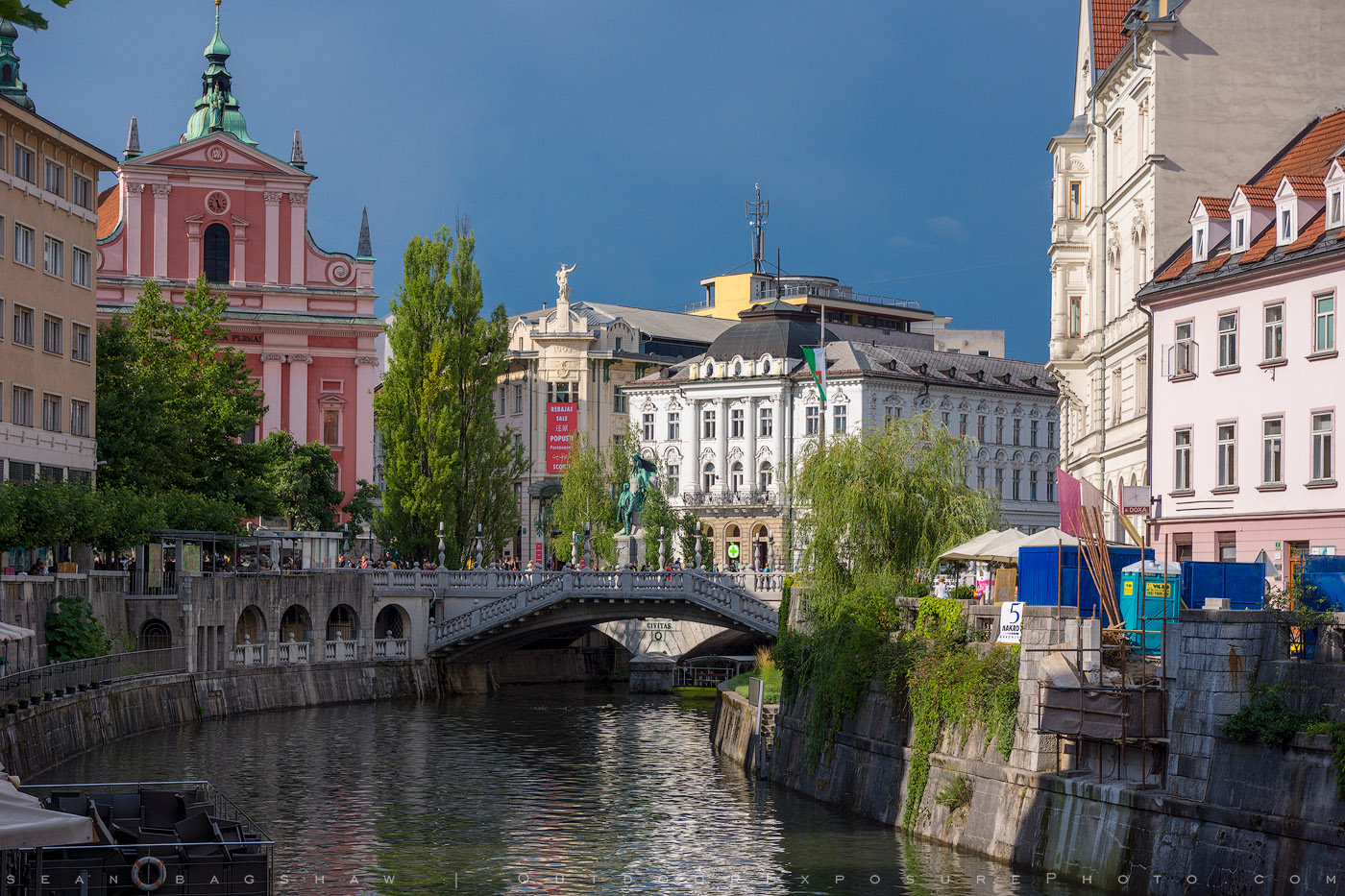 A view in downtown of the Ljubljanica River passing through Ljubljana, Slovenia.