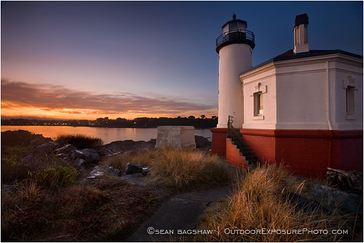 The Coquille River Lighthouse stands at day break along the shoreline of Bandon, Oregon.