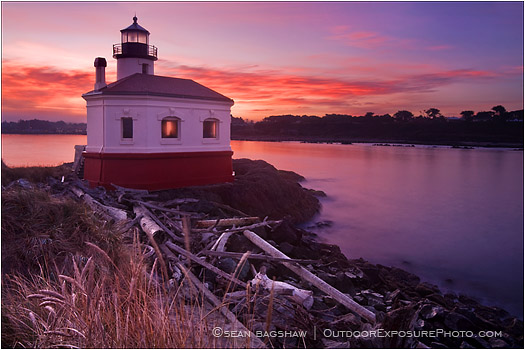 Outdoors, Lighthouse, Day, Pacific Ocean, Color Image, Coastline, Coast, Shore, Rocks, Sky, Clouds, Coquille River Lighthouse, Bandon, No People, Building Exterior, Oregon, sunrise, horizontal