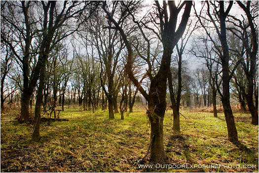A late winter day of misty air imparts a lonely quality to this grove of trees in the Cosumnes River Wildlife Preserve, California. The Consumnes River, in the Central Valley and only 80 miles long, has frequent winter and spring overflows which foster the growth of native plants and wildlife. Hundreds of species of birds and plants are found in the preserve which encompasses and protects thousands of acres of wetlands and woods.