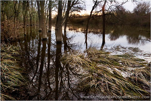This image is typical of scenes in the Cosumnes River Wildlife Preserve, California. The Cosumnes River, in the Central Valley and only 80 miles long, has frequent winter and spring overflows which foster the growth of native plants and wildlife. Hundreds of species of birds and plants are found in the preserve which encompasses and protects thousands of acres of wetlands and woods. I liked the patterns and reflections made by the waterlogged trees and marsh grasses.