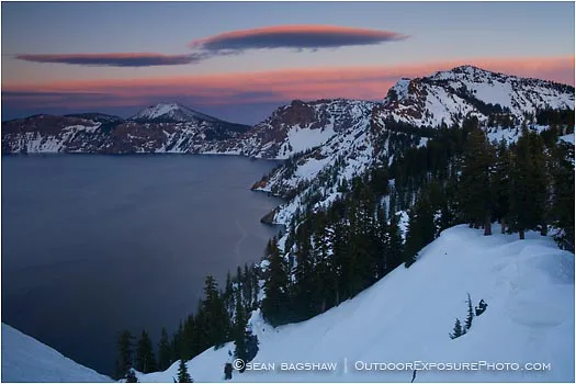 Crater Lake National Park in Oregon draws visitors from all over the world. The lake which was formed in the volcanic caldera of Mt. Mazama is the deepest in the United States at 1,949 feet. It is solely fed by rain and snowfall. A rim road circles the lake and gives viewers spectacular vistas of the serene and crystal clear lake and the surrounding volcanic rock faces. This winter image at sunset gives the water a rich velvety texture.v