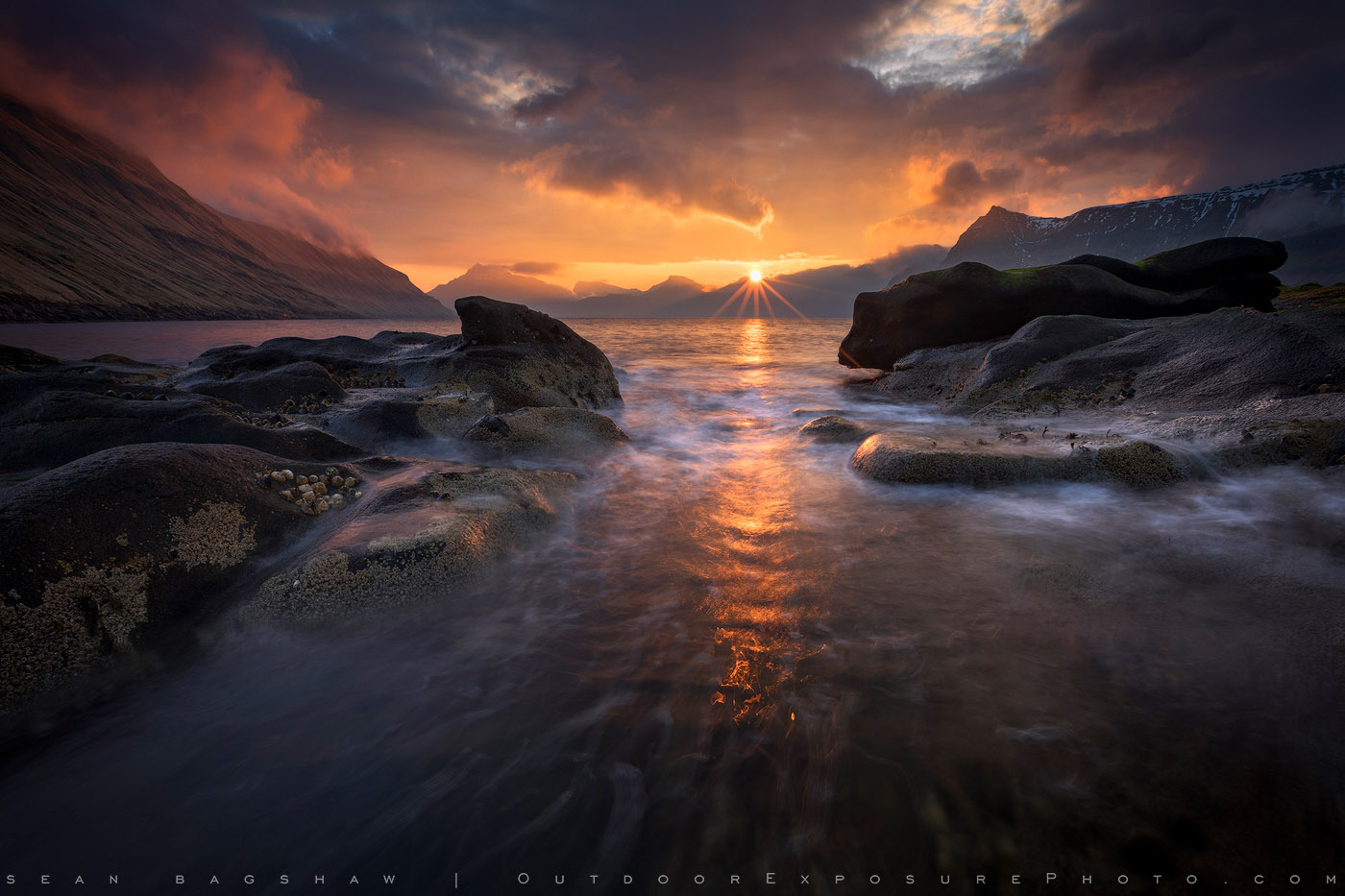 The photo was taken on the shore of Eysturoy but the sun is peeking over the island of Kalsoy in the distance. Many of the islands are separated by narrow channels so it can be hard to know where one ends and the next begins.