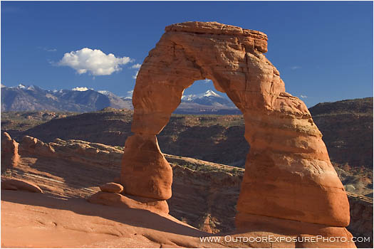 Grand and unique, Delicate Arch has balanced on its red sandstone pillars over eons of time. Located in Arches National Park, Utah it has become the symbol of the state and appears on license plates, stamps and a multitude of printed materials enticing tourists to its magnificent scenery.