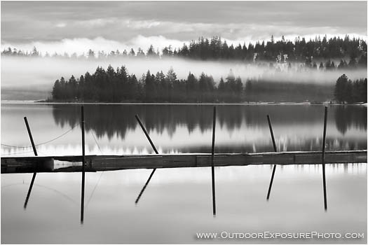 On a crisp winter morning in the southern Oregon Cascades mist rises off Hyatt Lake as gentle breezes carry it through the surrounding forest. Reflections on the still water create an unusual perspective of the fishing dock.