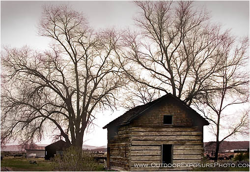 Late fall in Dorris, California near the Oregon border creates a chilly gray scene around this weathered homestead ranch building and leafless trees. Dorris with a population of just over 800 was established in the early 1900s when the railroad came through the area.