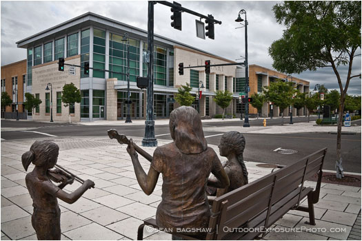 Statues of a group of musicians playing sits across from the Library in downtown Medford in Southern Oregon.