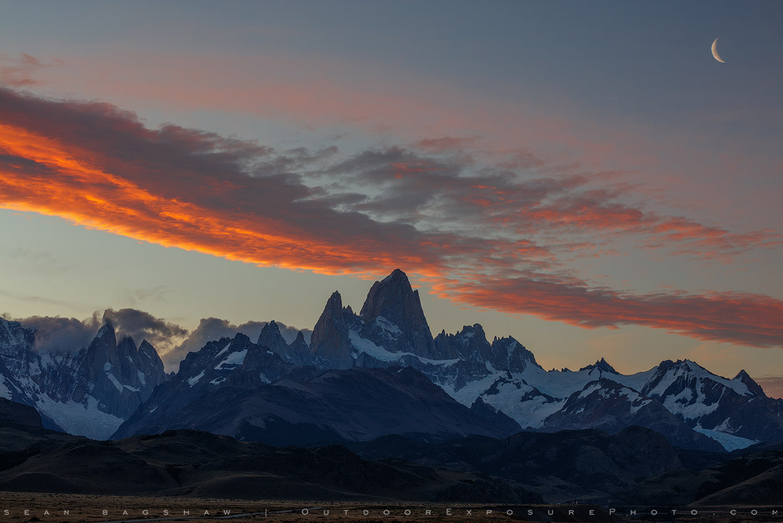 This is sunset behind El Chaltén which means Smoking Mountain in Tehuelche, the language of the ancient nomadic hunters who lived in this part of Patagonia. They named it so because the mountain is almost always shrouded in cloud.