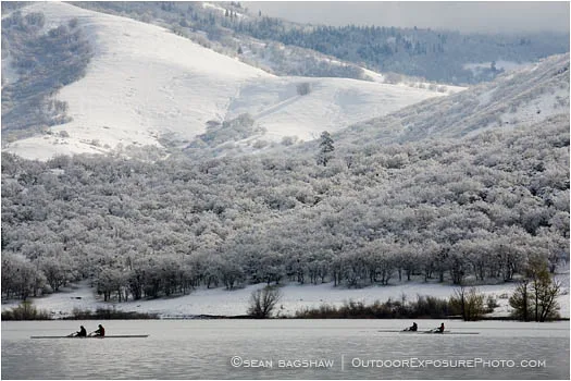 Snow and ice don’t deter this pair of rowers on a brisk morning outing on Emigrant Lake near Ashland, Oregon. Ashland Rowing Club members can be seen on the lake year ’round and prefer the early, calm part of the day to practice their skills.