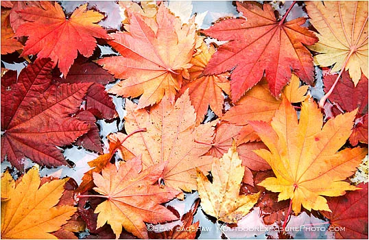 Freshly fallen vibrant red, yellow and gold leaves float gently on a pool of water.