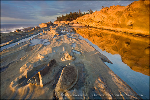 Waning evening light sets the sandstone cliffs on fire and plays with reflections and shadows on the rugged rock formations. Carved by relentless wave action this rugged seascape along the Oregon Coast at Shore Acres State Park, is a delight to photograph. Shore Acres was originally an estate owned by timber baron, Louis Simpson who sold it to the state in 1942. It now boasts 5 acres of spectacular gardens and is a popular area for gray whale and storm watching. The rocky and rugged shoreline has one secluded sandy beach often frequented by picnickers.