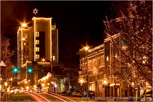 At night during the winter holiday season, downtown Ashland, Oregon is brilliant with thousands of holiday lights. Main Street features lights on the Oregon Shakespeare Festival, the Varsity Theater and the Ashland Springs Hotel.