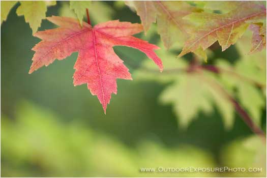A bright red Maple leaf leads the change from summer green to autumn brilliance.