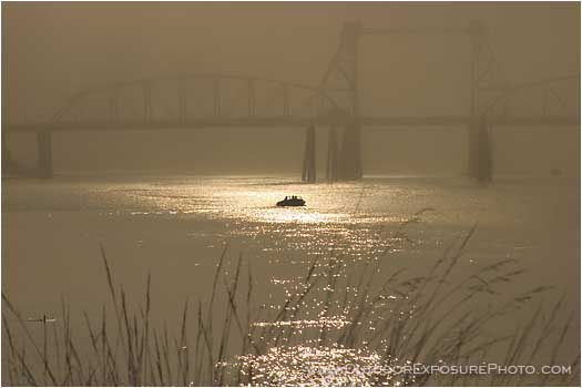 Optimistic fishermen head out in their small boat on the Coquille River near Bandon, Oregon. They are spotlighted in the early morning light while the bridge and surrounding shores are shrouded in heavy fog.