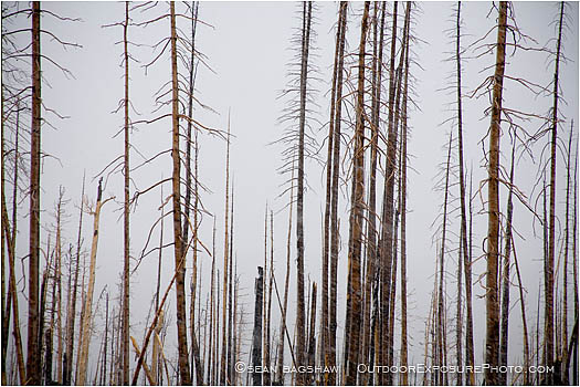 Still standing, but just a skeleton of a once grand forest, this is all that is left after a fire in Glacier National Park.