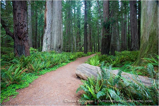 Stout Grove Trail in Jedediah Smith Redwoods State Park meanders through California Redwoods or Giant Sequoias. Ancient Redwoods can live up to 2,000 years and are the tallest tree on earth reaching over 300 feet. The park, located near Crescent City in Northern California, offers cool, shady fern-lined hiking trails, picnic areas and camping.