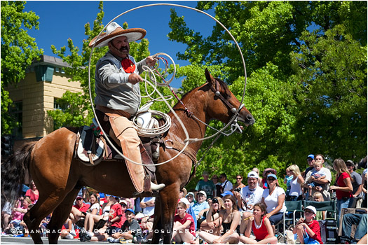 Ashland Oregon during the 4th Of July Parade. A rider from El Tapatio Restaurant entertains the crowd.