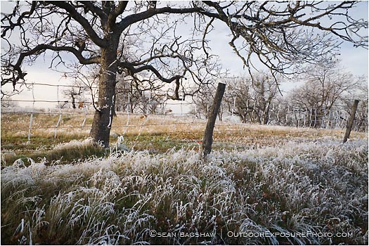 An oak tree and an old fence emerge from their frosty coatings after some cold winter weather in the Rogue Valley of southern Oregon.