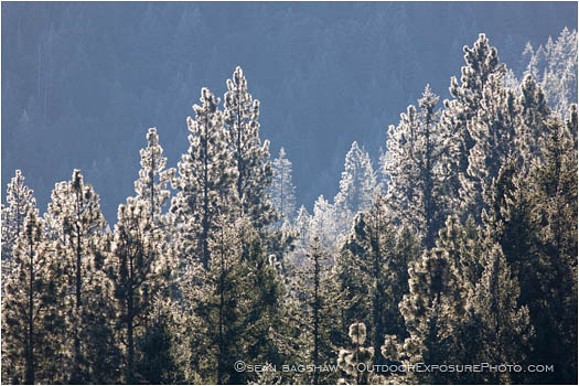 A hillside forest glows in the morning light as the sun hits these trees from behind.