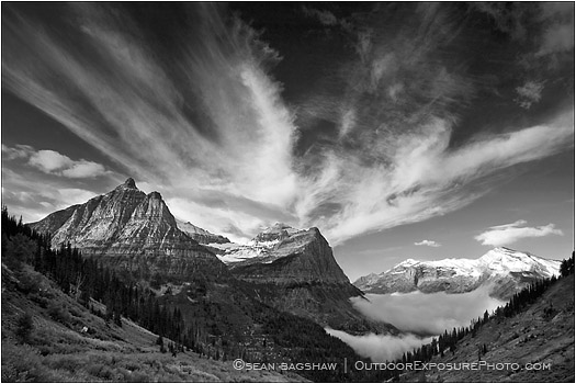Sometimes the sky is so exhilarating it takes your breath away. These majestic mountains, giant feather clouds and the thick, creeping fog made for a picture perfect combination. I took this image on a 2008 trip to Glacier National Park, Montana. This area is along the historic Going to the Sun Road and looks back down the west side of the divide. Constructed in 1932, the road is the main parkway through Glacier and travels over Logan Pass which can receive up to 80 feet of snow in the winter. The road is so narrow and winding in places that vehicles longer than 21 feet are restricted from travel.