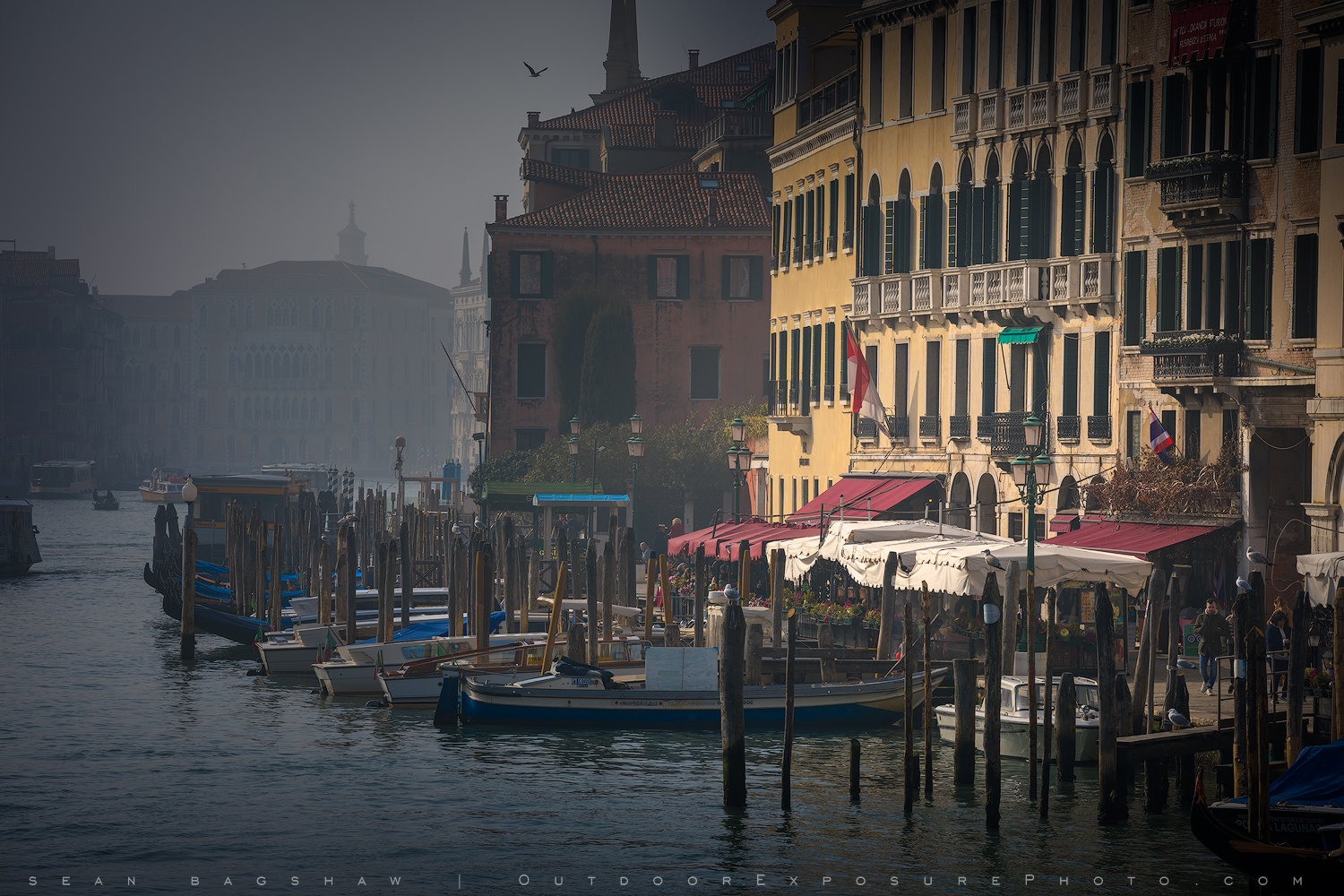 A foggy day on the Grand Canal in Venice Italy. Bright colors abound in this city with maze like canals and gorgeous alleyways in which to get lost.e.