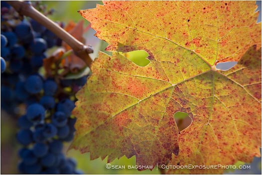 A vibrant fall leaf in a grape vineyard.
