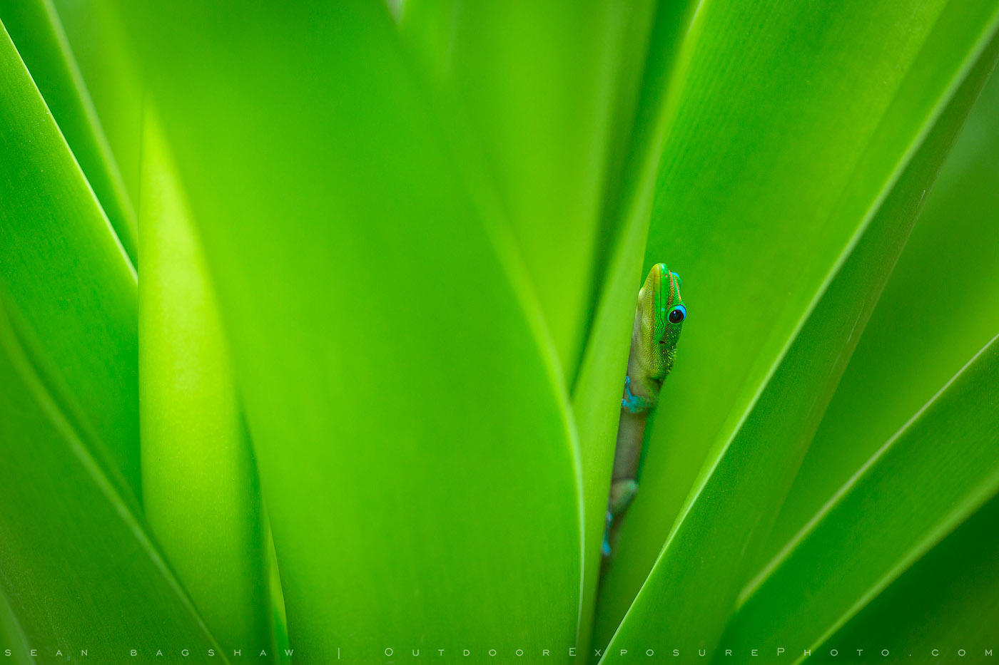 A Green Anole peeks out from greenery in the forests of the Big Island of Hawaii.