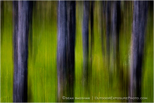 Abstract blurs and streaks of deep blues and greens are created by camera movement in an Oak forest in Southern Oregon.