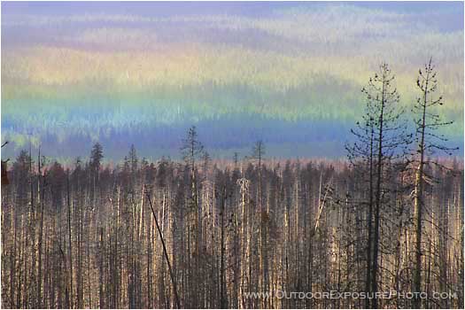 A beautiful ground rainbow is seen over the tops of a burned forest in Central Oregon in the Cascade Mountains.