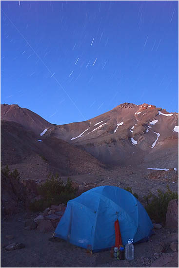 hidden, valley, camp, camping, mt. shasta, california, night, evening, star, star trails, snow, rocks, dirt, tent, quiet, vertical, color image