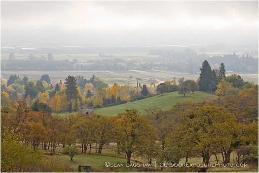 Rolling green hills spotted with trees overlook the open fields in Medford, Oregon.