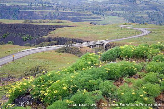 Columbia, Columbia River, Gorge, river, Rowena Point, spring, Tom McCall preserve, wildflowers, old, historic, columbia river highway, highway, road, paved, curved, bridge, winding, Oregon, horizontal, color image