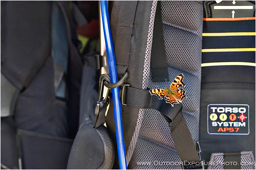 hitchhiker, ride, riding, landed, bag, backpack, butterfly, insect, riding, attached, land, horizontal, color image